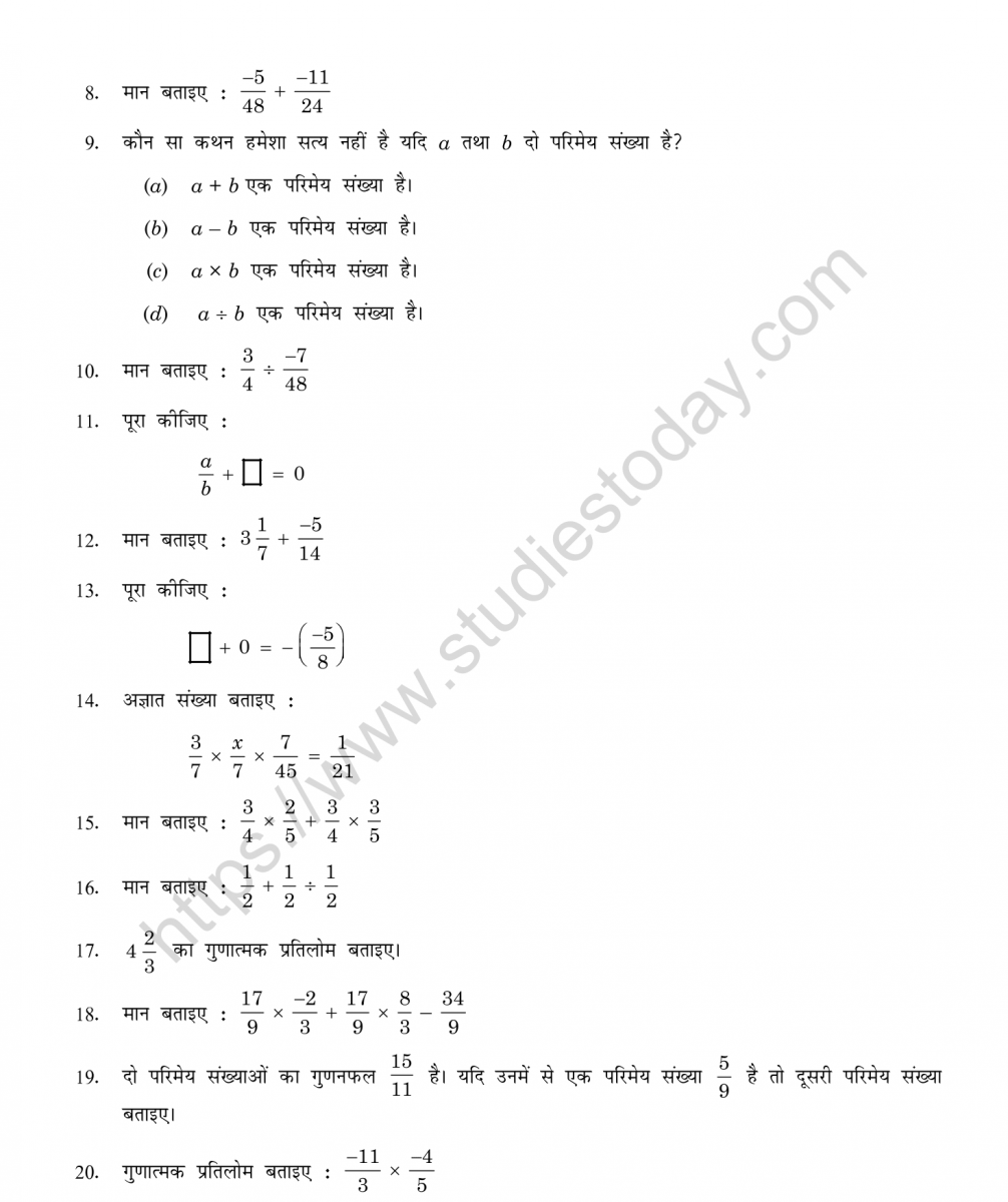 Read and download free pdf of CBSE Class 8 Mental Maths Rational Numbers Worksheet in Hindi. Download printable Mathematics Class 8 Worksheets in pdf format, CBSE Class 8 Mathematics Chapter 1 Rational Numbers Worksheet has been prepared as per the latest syllabus and exam pattern issued by CBSE, NCERT and KVS. Also download free pdf Mathematics Class 8 Assignments and practice them daily to get better marks in tests and exams for Class 8. Free chapter wise worksheets with answers have been designed by Class 8 teachers as per latest examination pattern